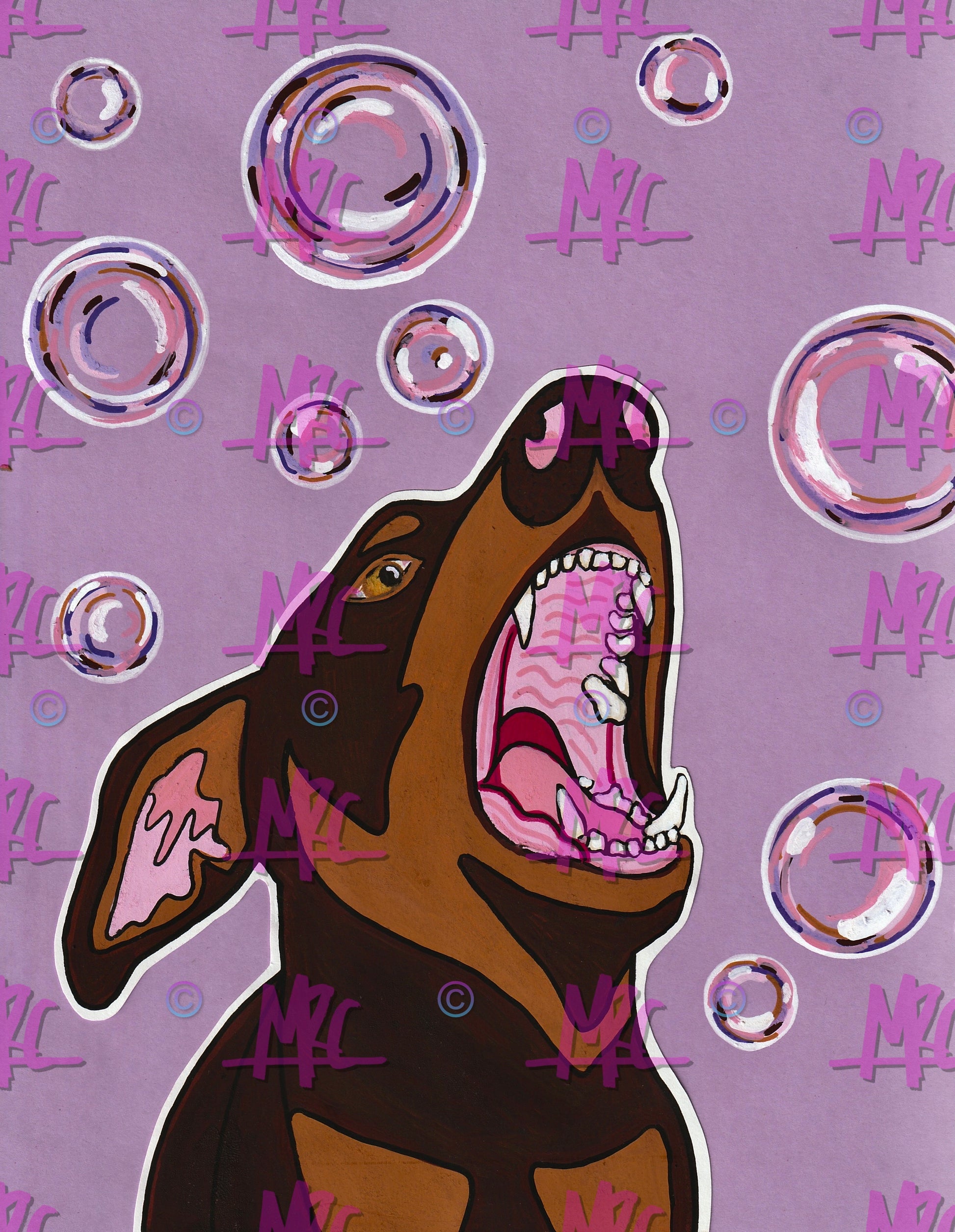 Ferda (named for our favorite show) is my Doberman puppy. She's a silly, dirty girl who likes to get into mischief, so when I get a good picture of her playing, I like to see if I can draw it. Inspired by real events. This is originally a mixed media piece that features an acrylic paint pen drawing on cardstock, pasted onto another piece of cardstock with a background also painted in acrylic paint pens. Limited run of 250 prints.